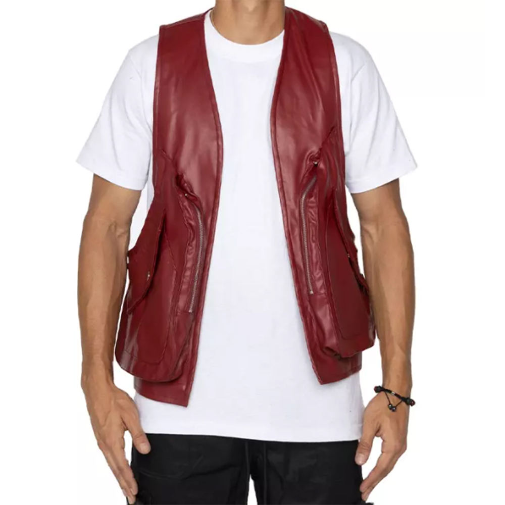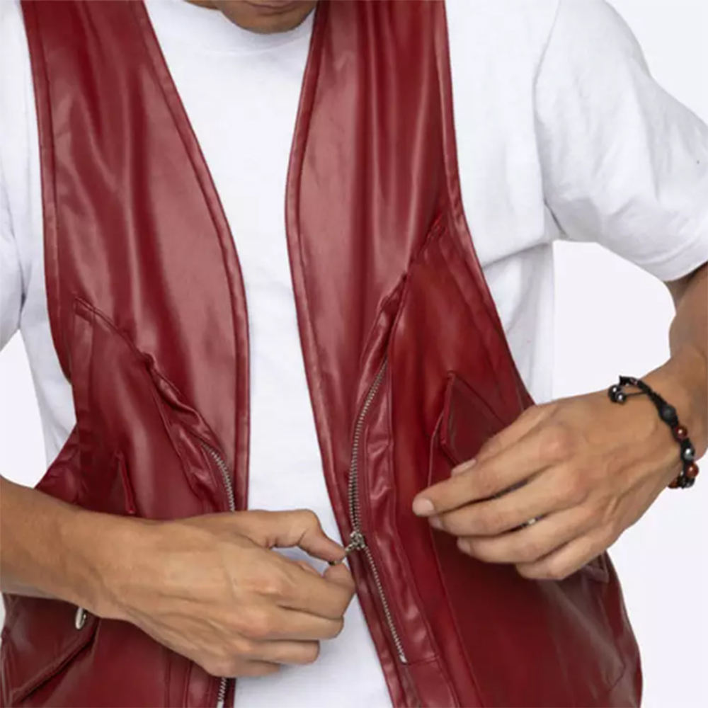 Bike Red Leather Vest Custom Made Mens Zipper Cargo Pocket V neck Sleeveless PU Leather Vest Jacket