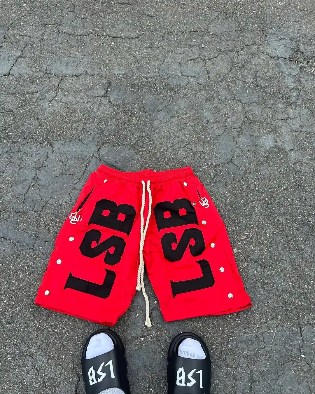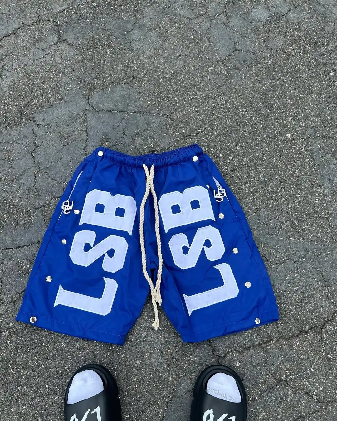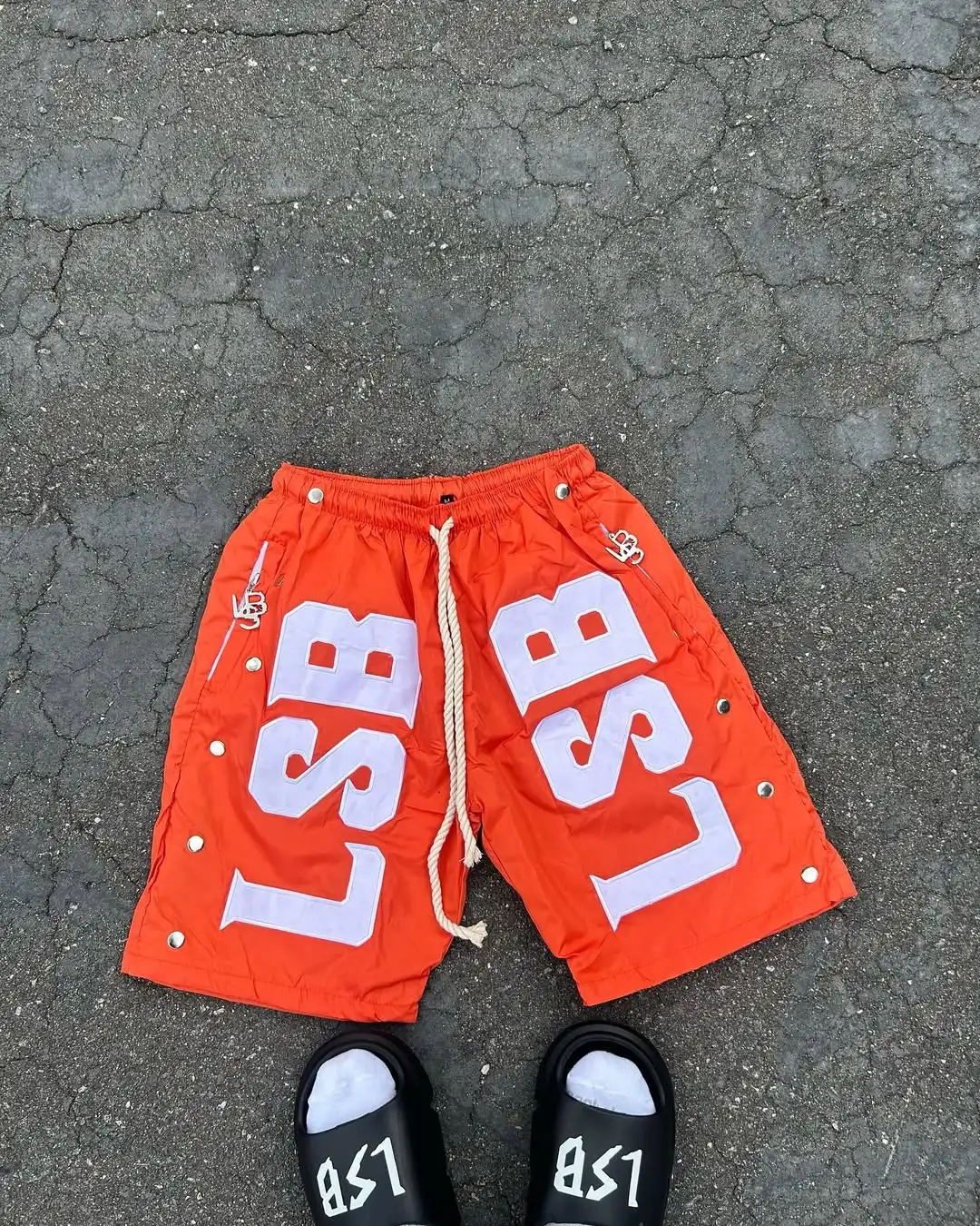 Package Description High-quality streetwear shorts designed with bold oversized “LSB” lettering, creating a strong and eye-catching urban look. These shorts are built for brands that want to stand out with clean yet powerful logo-focused designs. Crafted from premium nylon fabric, these shorts are lightweight, durable, and comfortable—perfect for summer wear and everyday styling. The addition of metallic snap button detailing along the sides enhances both functionality and streetwear appeal. The elastic waistband with a thick adjustable drawstring ensures a secure and flexible fit, while the relaxed silhouette provides maximum comfort and movement. Key Features: Premium nylon fabric Lightweight, breathable & durable Bold oversized “LSB” logo print Side snap button detailing Elastic waistband with heavy drawstring Relaxed fit for comfort High-quality finishing and stitching Color Variants: Black / White Blue / White Red / Black Orange / White Customization: Available in all colors, sizes, and custom logos. Full branding options including printing, embroidery, patches, and private labeling. Ideal for streetwear brands and bulk production. Small quantity orders are accepted.