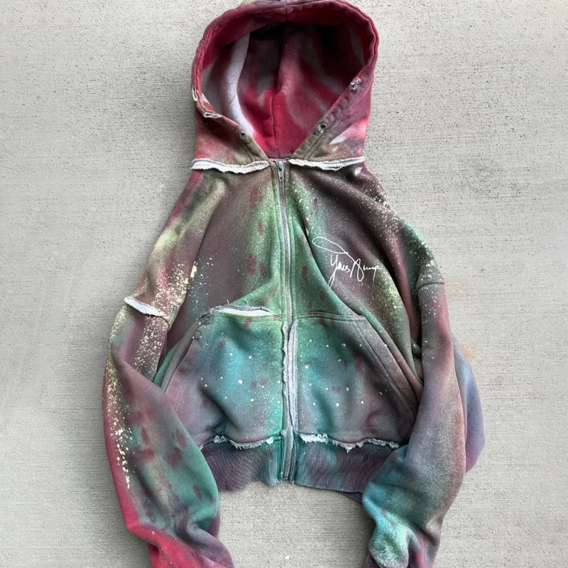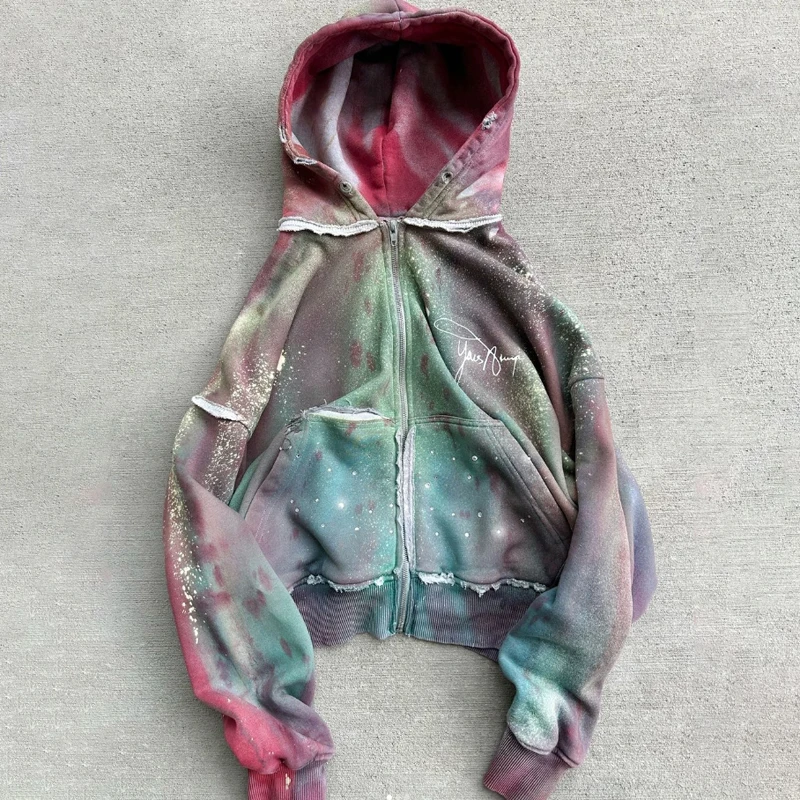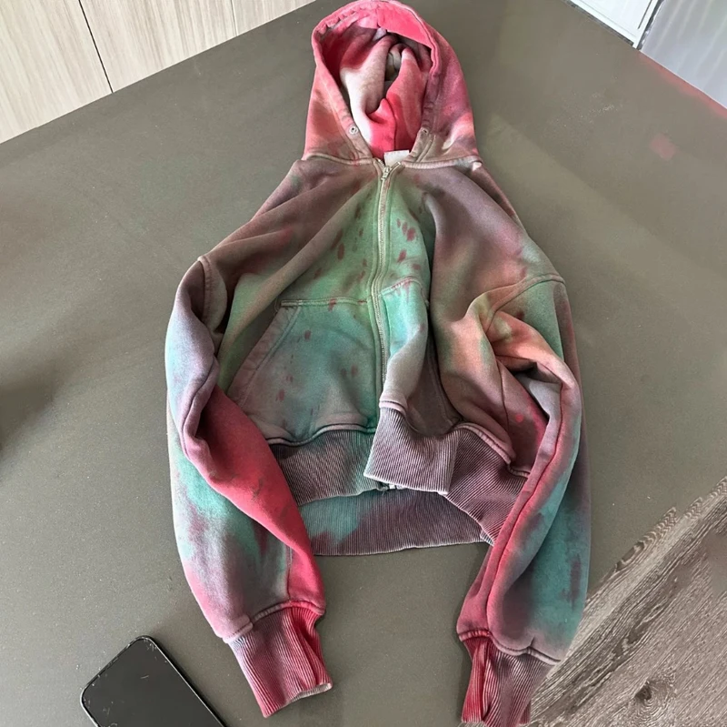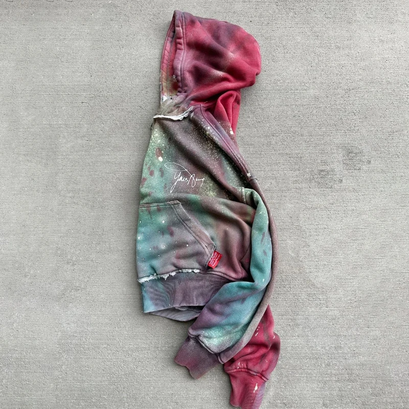 | Package Description | This premium zip-up hoodie showcases a unique artistic design with a vibrant multi-color washed finish. Blending shades of green, pink, and muted tones, the hoodie features a vintage-inspired gradient dye effect that creates a distinctive and eye-catching streetwear look. The garment is enhanced with subtle paint-splatter detailing and raw-edge seam accents, adding a handcrafted and distressed aesthetic. A minimal embroidered signature-style logo on the chest gives the hoodie a refined branding element while maintaining a clean, modern appearance. Crafted from high-quality cotton-blend fleece, the hoodie provides warmth, softness, and durability for everyday wear. The full-length zipper ensures easy functionality, while the spacious hood, ribbed cuffs, and hem offer a comfortable and structured fit. | ||||||||