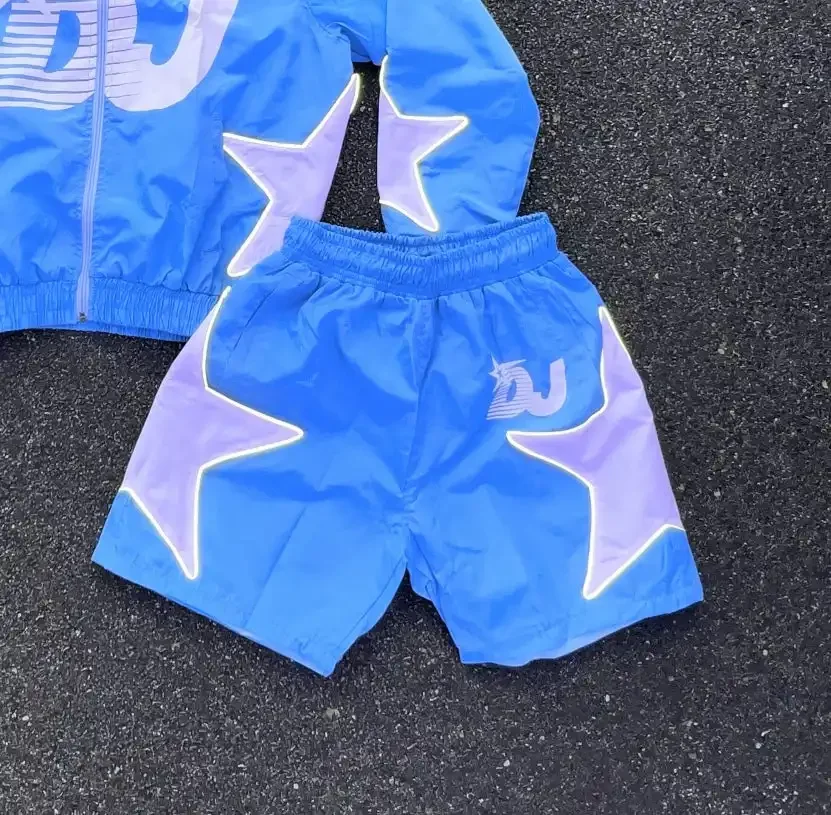 | Package Description | A modern streetwear tracksuit set designed with bold reflective star graphics and a clean, athletic aesthetic. This set features a lightweight zip-up jacket paired with matching shorts, delivering both style and functionality for everyday wear. The standout reflective detailing enhances visibility and gives the outfit a unique glow effect under light, making it perfect for both day and night styling. Crafted from high-quality polyester / nylon blend, the fabric is lightweight, breathable, and durable — ideal for active lifestyles and streetwear fashion. Key Features: Premium lightweight polyester / nylon fabric Breathable, durable & comfortable Reflective star graphics for standout look Matching jacket & shorts set Full front zip jacket Elastic waistband with drawstring (shorts) Relaxed / athletic fit Smooth & slightly water-resistant finish Color: Sky Blue with Reflective White Graphics Customization Options: Custom logos & graphics Reflective / puff print / embroidery options Fabric quality & GSM customization Private labeling & packaging Low MOQ available | ||||||||