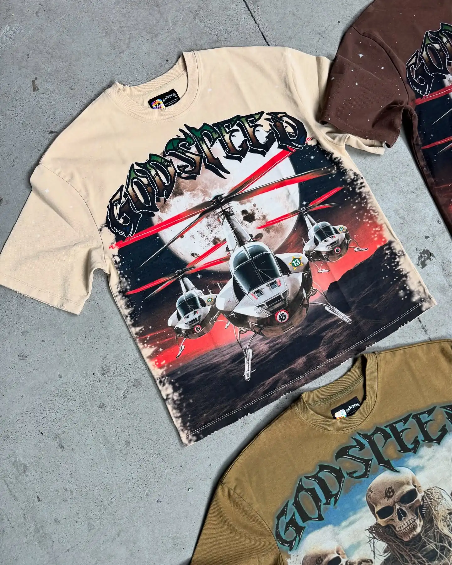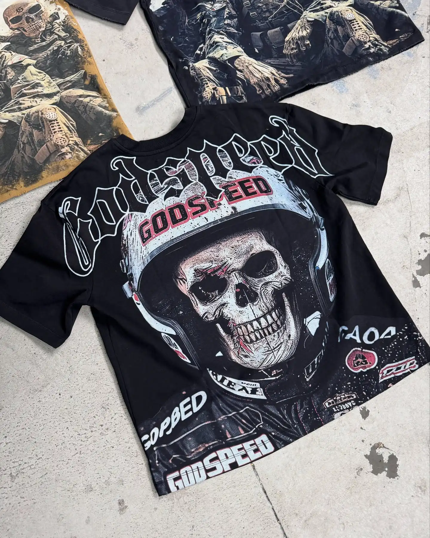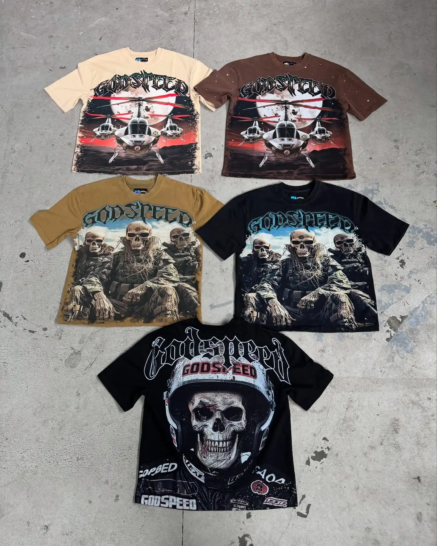 Package Description This premium streetwear T-shirt collection features bold, high-impact “Godspeed” graphics designed for brands that want strong visual storytelling and standout pieces. Each design combines detailed artwork with a rugged, edgy aesthetic inspired by military, racing, and futuristic themes. From helicopter visuals to skull soldier graphics and racing helmet concepts, every piece delivers a unique identity while maintaining a consistent streetwear vibe. Key Features: Premium cotton fabric for comfort and durability High-definition full-front graphic prints Multiple design variations (military, skull, aviation, racing themes) Washed and vintage-inspired color effects Relaxed / oversized streetwear fit Soft, breathable material for all-day wear High-quality stitching and finishing Available Colors: Black Brown Beige / Sand Washed tones (vintage effect) Perfect for streetwear brands, summer drops, and graphic-heavy collections looking to create a strong market presence.