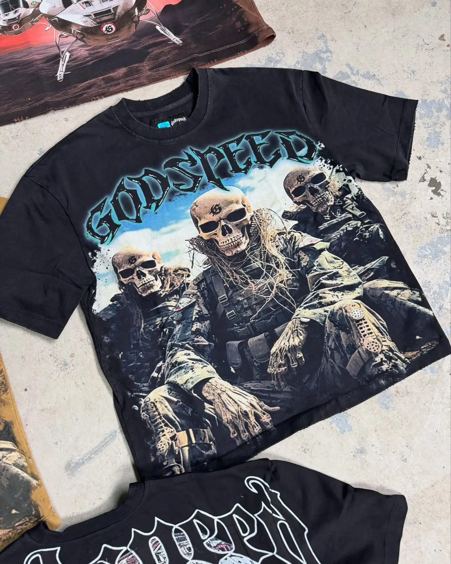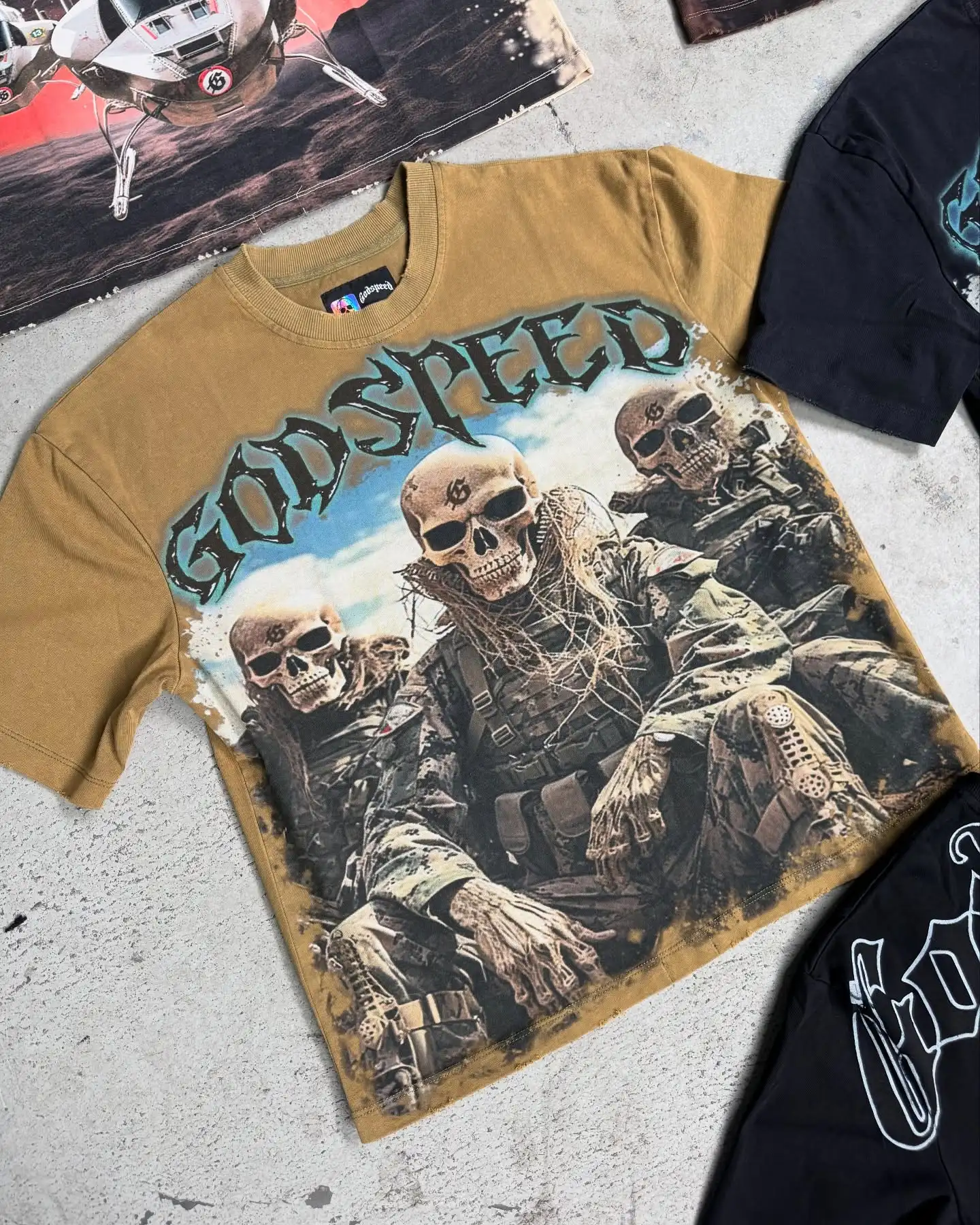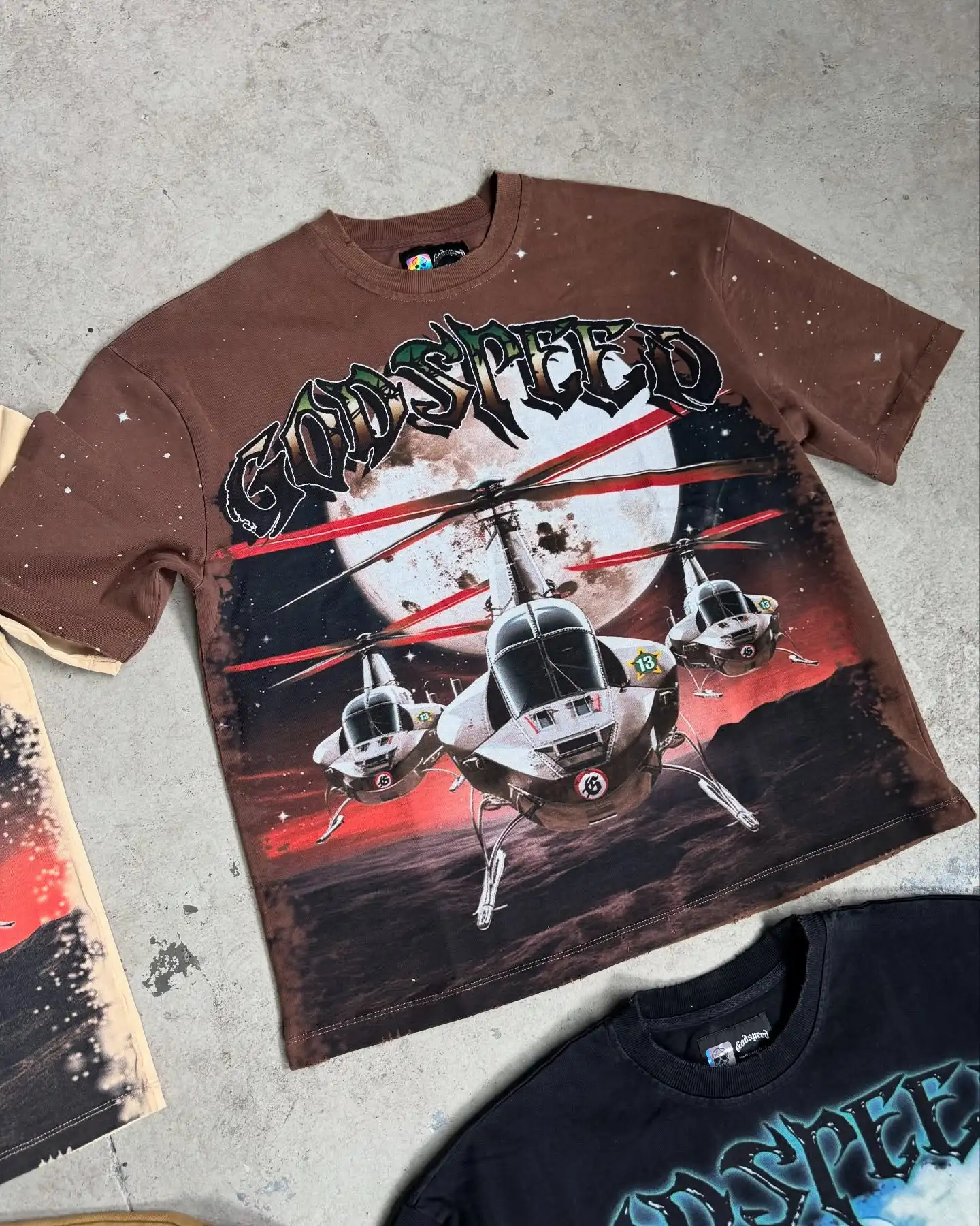 Package Description This premium streetwear T-shirt collection features bold, high-impact “Godspeed” graphics designed for brands that want strong visual storytelling and standout pieces. Each design combines detailed artwork with a rugged, edgy aesthetic inspired by military, racing, and futuristic themes. From helicopter visuals to skull soldier graphics and racing helmet concepts, every piece delivers a unique identity while maintaining a consistent streetwear vibe. Key Features: Premium cotton fabric for comfort and durability High-definition full-front graphic prints Multiple design variations (military, skull, aviation, racing themes) Washed and vintage-inspired color effects Relaxed / oversized streetwear fit Soft, breathable material for all-day wear High-quality stitching and finishing Available Colors: Black Brown Beige / Sand Washed tones (vintage effect) Perfect for streetwear brands, summer drops, and graphic-heavy collections looking to create a strong market presence.